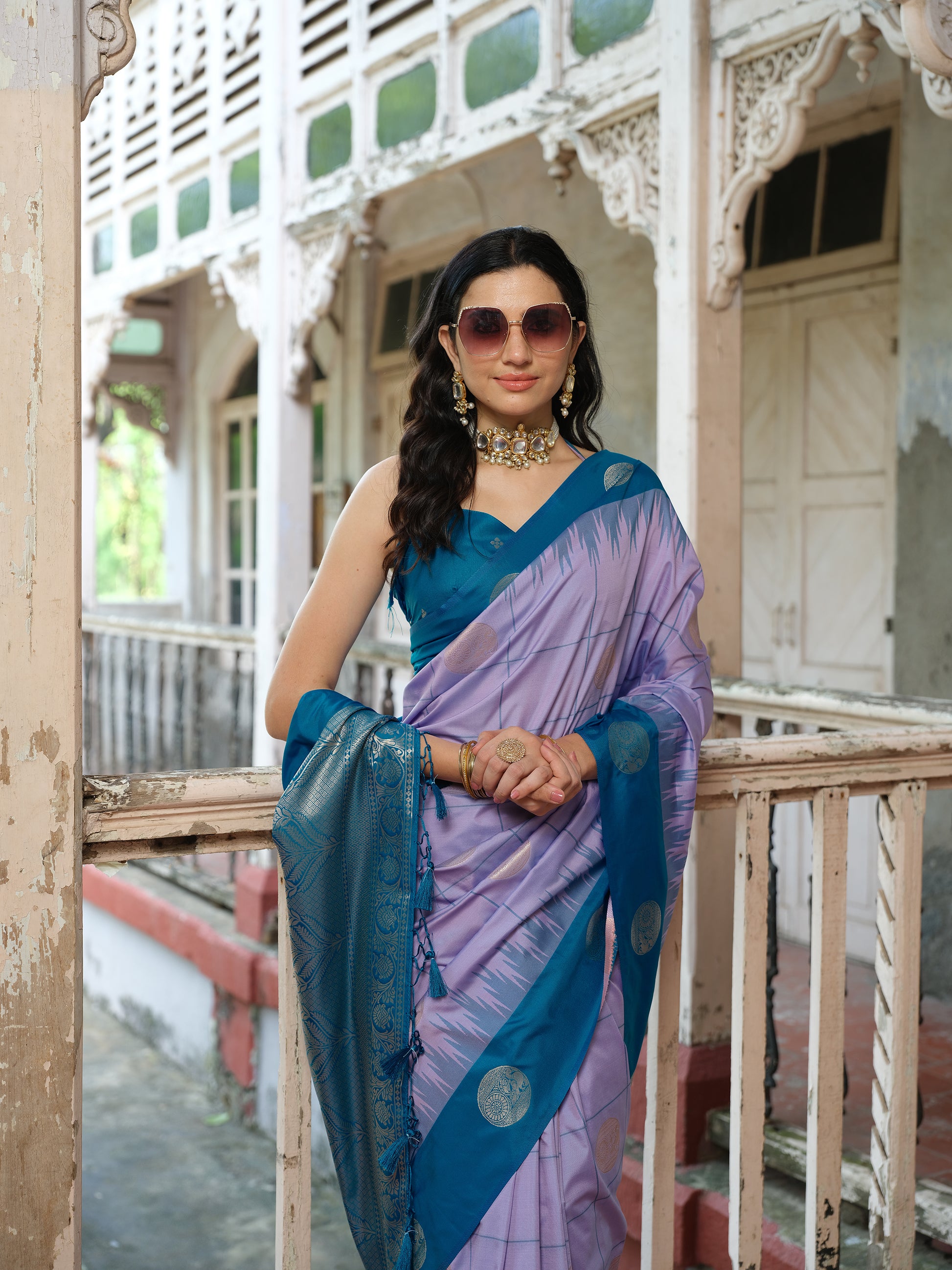 - Border & Pallu: Deep Teal Blue with Ikkat border