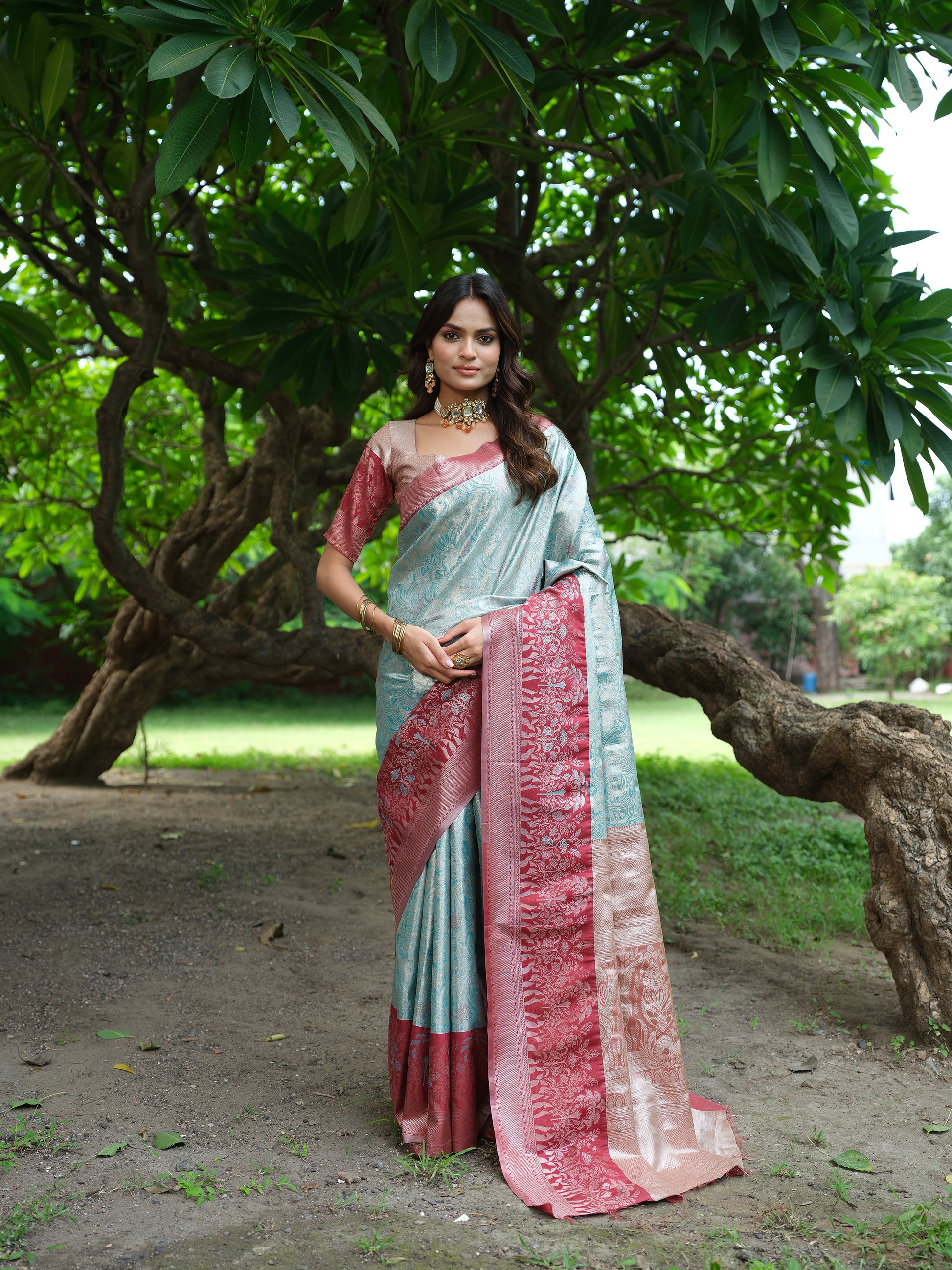 Tissue Silk Saree - Pastel aqua blue body and wine border